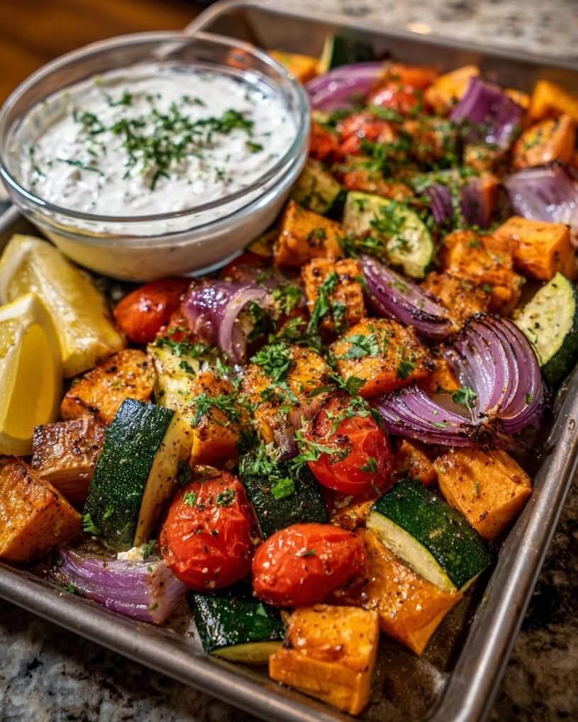 This sheet-pan dish brings together classic Mediterranean flavors in a simple, balanced meal. Roasted vegetables like bell pepper, zucchini, onion, and cherry tomatoes caramelize beautifully in the oven, while feta adds a creamy, salty touch. A light lemon yogurt sauce ties everything together with freshness and tang. With optional add-ins like sweet potato or cauliflower, it’s a flexible recipe you can tailor to your taste.