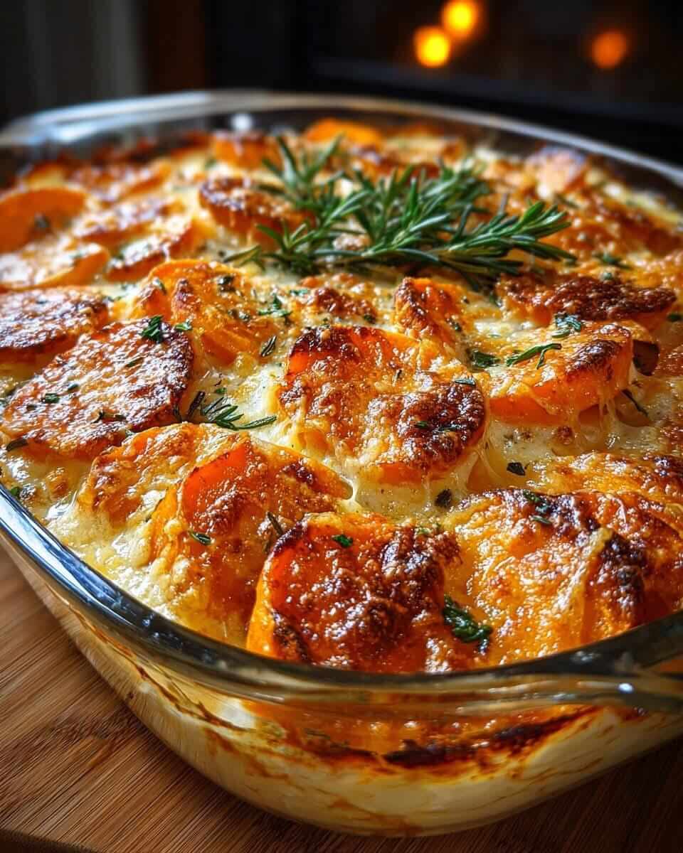 Mediterranean Scalloped Sweet Potatoes with Smoked Gouda and Rosemary is a comforting yet sophisticated side that highlights the best of simple, wholesome ingredients. The smoky cheese, fragrant herbs, and creamy sauce elevate the humble sweet potato into something special. Whether you serve it for a family dinner, a festive holiday meal, or a cozy weekend gathering, this dish delivers warmth, flavor, and elegance in every bite.