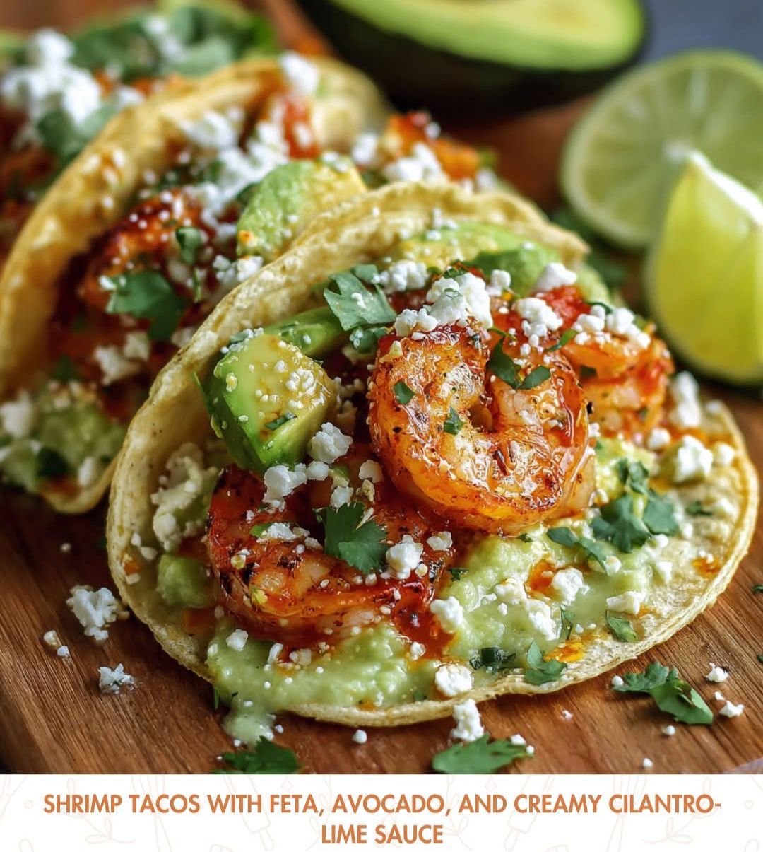 Mediterranean Shrimp Tacos With Feta, Avocado, and Creamy Cilantro Lime Sauce