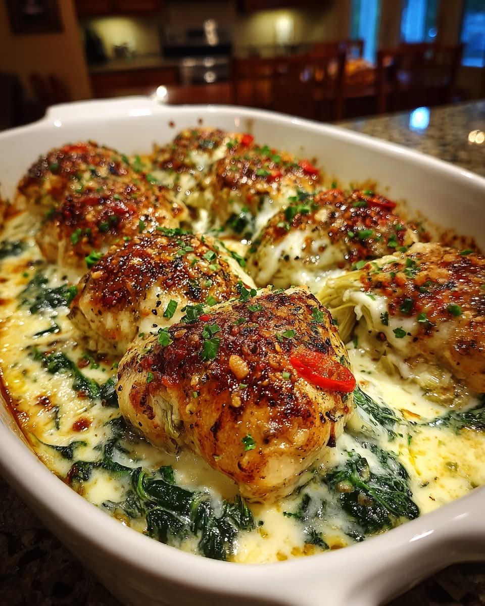 The Mediterranean Spinach Artichoke Chicken Bake delivers all the comfort of a creamy casserole with the freshness of Mediterranean flavors. The mix of tender chicken, garlicky artichokes, and melty cheese makes it both indulgent and balanced. It’s an easy one-dish meal that works for family dinners, meal prep, or entertaining guests. Serve it hot, with a drizzle of olive oil and a sprinkle of herbs, and you’ll have a dish that feels cozy, elegant, and completely satisfying.