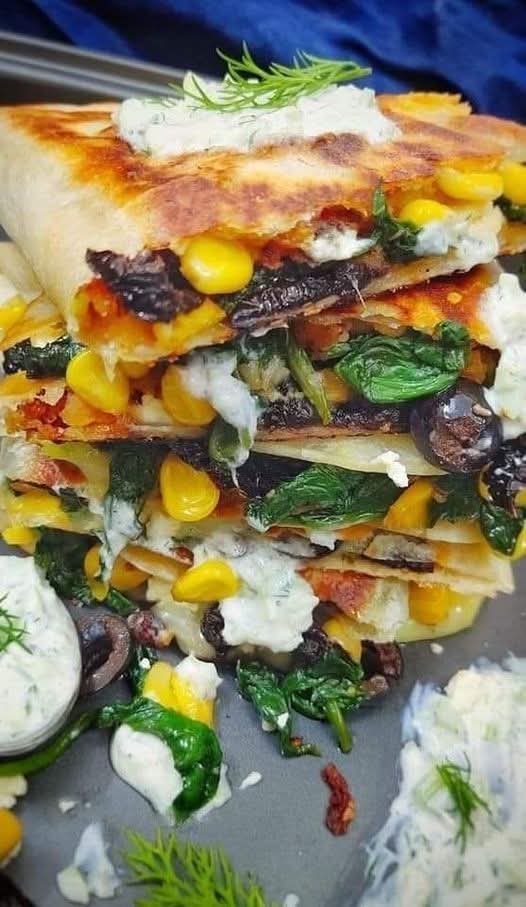 This Mediterranean spinach and corn quesadilla is easy to assemble and gives you a meal that feels fresh without requiring much cooking time. The vegetables soften just enough to blend with the melted cheese, while the olives and sun-dried tomatoes add a little depth. The homemade tzatziki brings a cool balance that works well with the warm tortilla. It’s the kind of recipe you can make for lunch, light dinner, or even a snack when you want something flavorful but not heavy. The best part is how flexible it is, letting you adjust the vegetables, cheese, and seasoning based on your taste or what’s already in your kitchen. If you’d like, I can also create a simplified, quick-card version for easy saving.