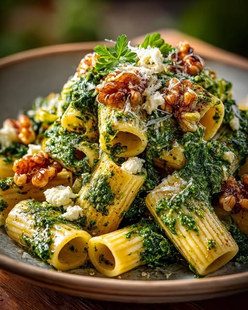 Mediterranean Spinach & Walnut Pesto Rigatoni with Brie Crumbles
