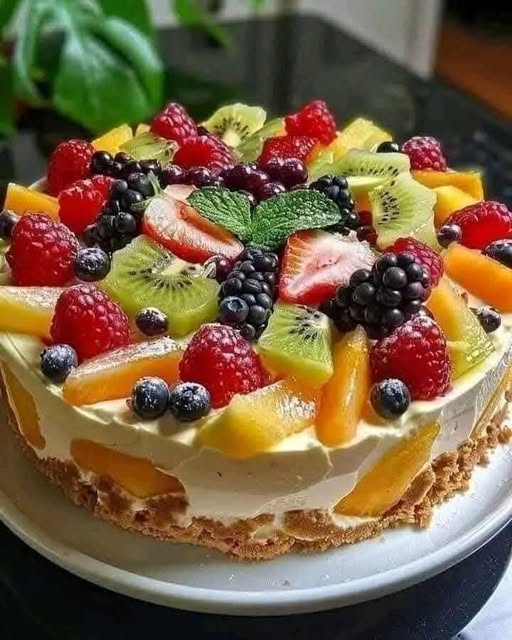 Arrange fresh berries, kiwi slices, and mango chunks on top.