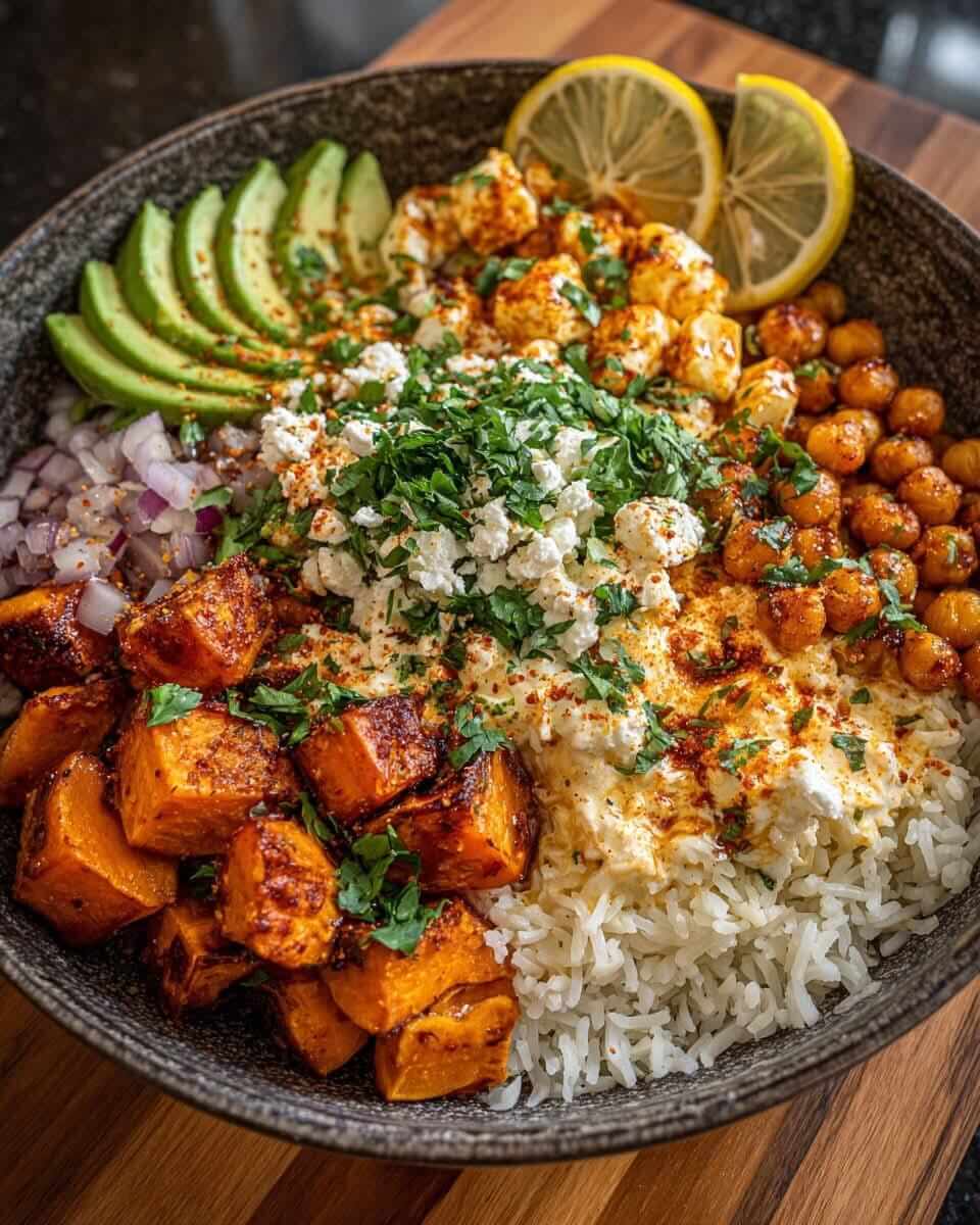 This Mediterranean Sweet Potato & Feta Rice Bowl with Hot Honey Sauce is proof that simple ingredients can come together to make something extraordinary. It’s colorful, nutritious, and full of contrast — creamy, crispy, sweet, and spicy all at once. Whether you’re craving a wholesome weekday lunch or an easy dinner that feels special, this bowl delivers both comfort and freshness in every bite.
