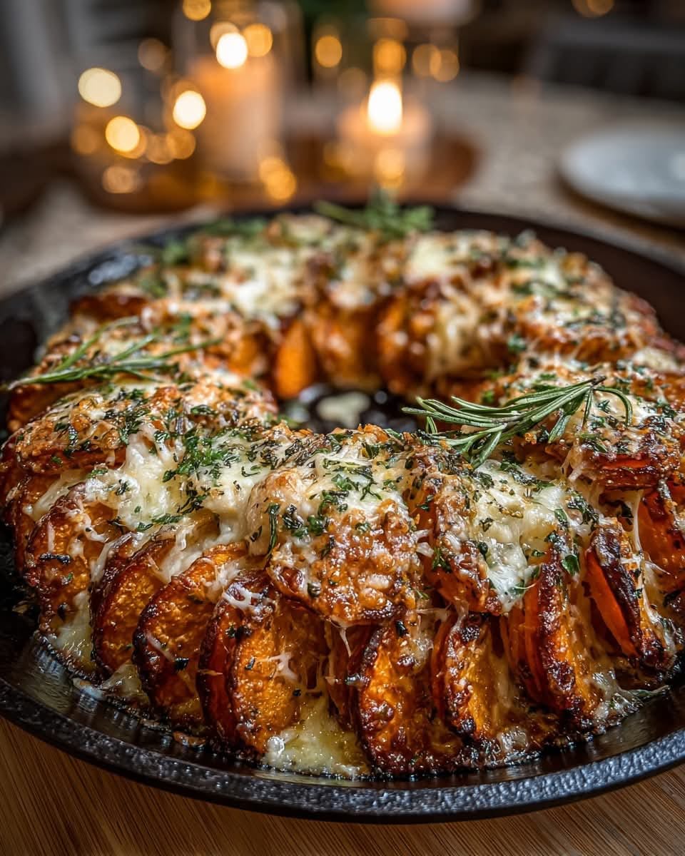 This Mediterranean Sweet Potato Gratin Wreath is as stunning as it is comforting. Layers of tender sweet potato slices are baked in a creamy garlic-thyme sauce, then arranged in a wreath shape for a beautiful presentation that’s perfect for holidays or special dinners. The combination of Parmesan and mozzarella adds a golden, cheesy crust, while fresh herbs bring out the naturally sweet, earthy flavor of the potatoes. It’s elegant, simple, and undeniably delicious — a side dish that feels festive and Mediterranean-inspired.