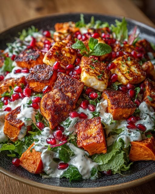 Mediterranean Sweet Potato, Halloumi & Pomegranate Salad with Mint Yogurt Dressing