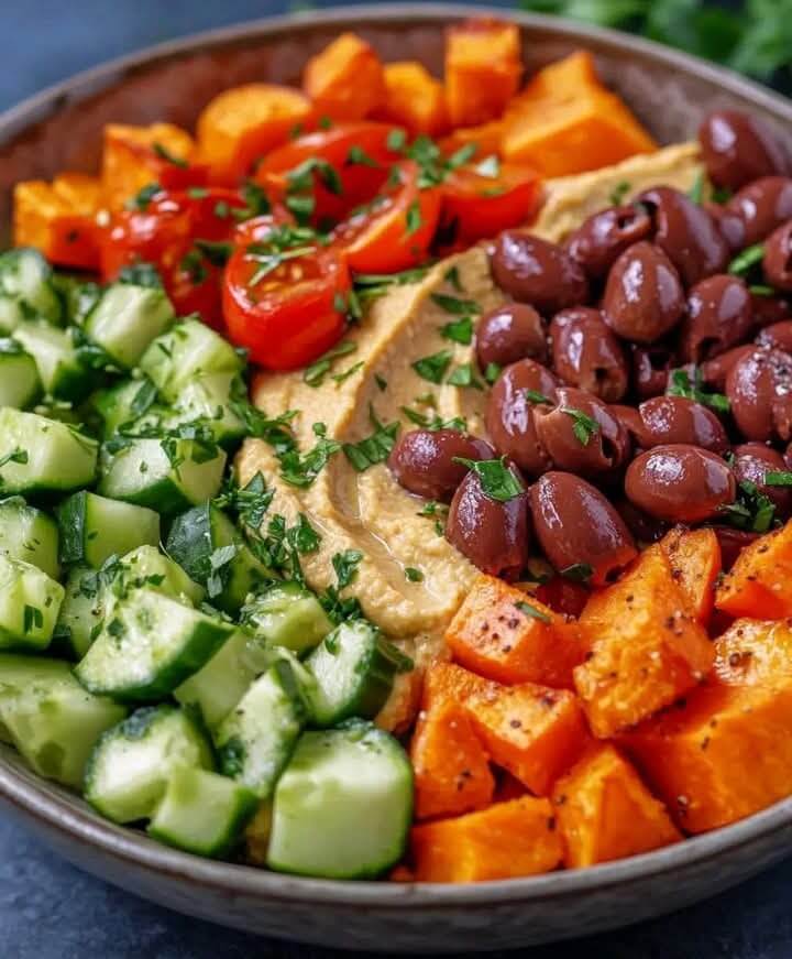 Mediterranean Sweet Potato Hummus Bowls are a vibrant nutritious and satisfying meal that’s easy to customize and perfect for meal prep. With creamy hummus roasted veggies and a zesty lemon tahini drizzle each bite delivers bold flavor and wholesome goodness. Whether for lunch dinner or a make-ahead meal this bowl brings the fresh feel of the Mediterranean to your table.