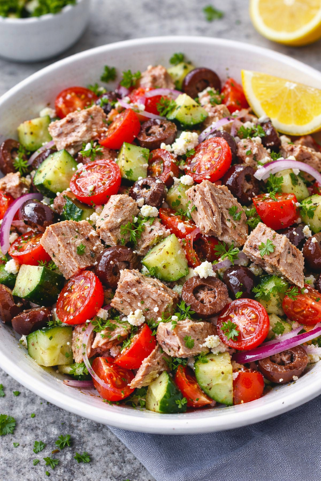 Mediterranean Tuna Salad is a fresh, vibrant, and protein-packed dish loaded with crisp vegetables, flaky tuna, briny olives, and creamy feta cheese. Tossed in a light olive oil and lemon dressing, this salad is bursting with bold Mediterranean flavours. It’s healthy, refreshing, and perfect for a quick lunch, light dinner, or meal prep option.