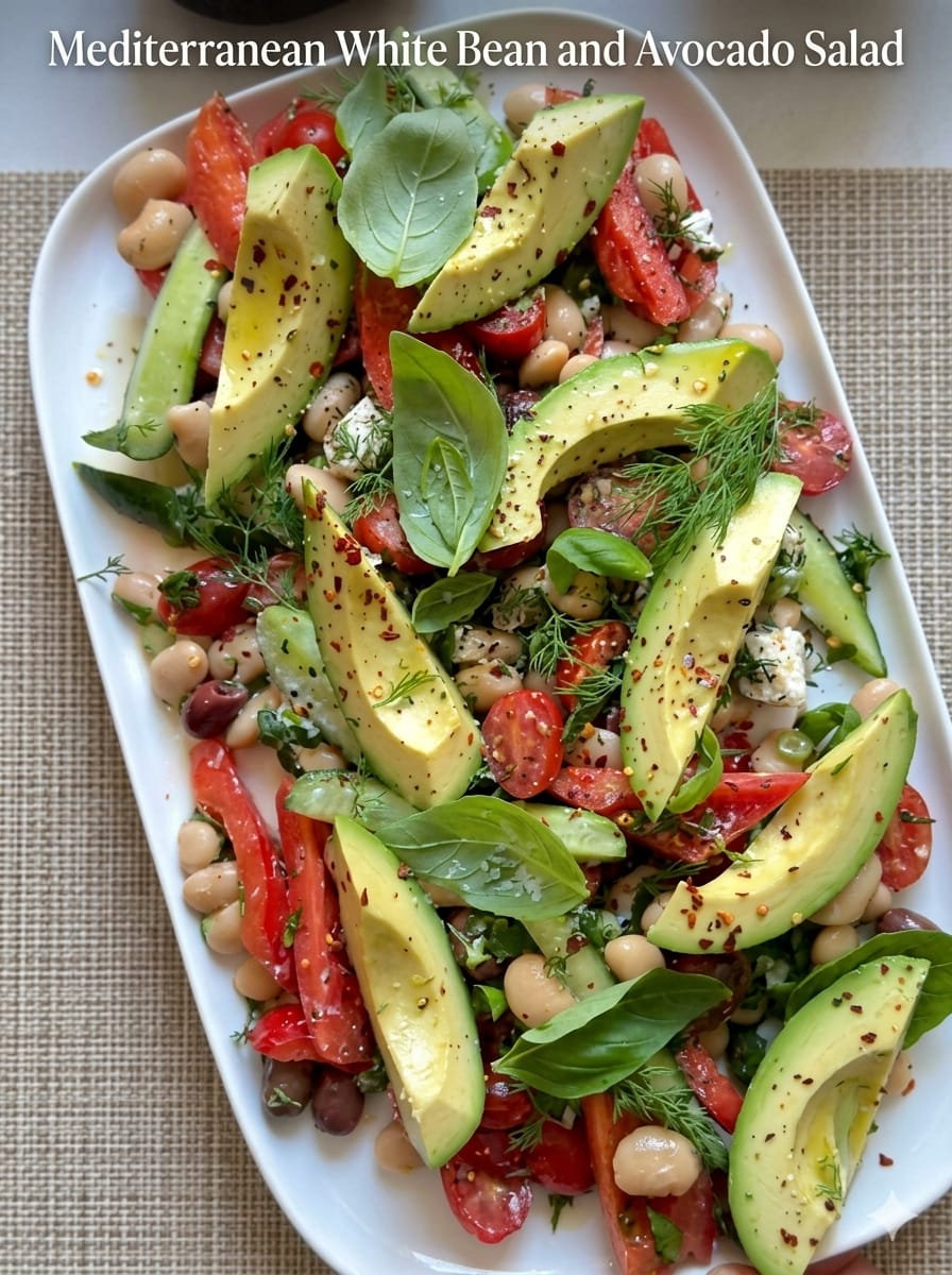 This Mediterranean white bean and avocado salad is fresh, creamy, and full of bright, clean flavors. It combines protein-rich beans with buttery avocado, crisp cucumbers, juicy tomatoes, briny olives, and plenty of fresh herbs. A simple lemon-garlic dressing brings everything together, making it a light but satisfying dish that works as a quick lunch, a side salad, or even a full meal on its own. It’s fast to prepare and naturally nutritious, with a perfect balance of textures in every bite.