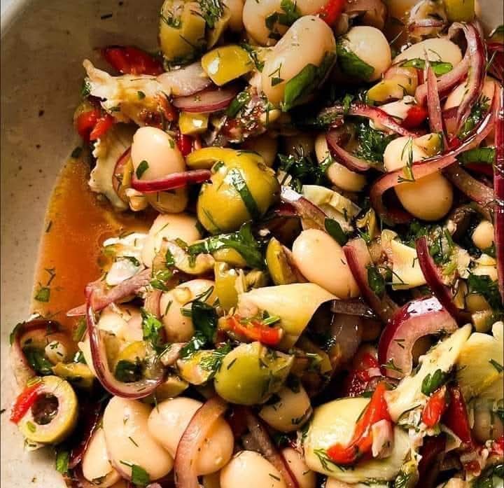 This hearty colorful salad is a flavor-packed dish inspired by Mediterranean cuisine. With creamy white beans tangy artichoke hearts briny green olives and sharp red onions it’s balanced by fresh herbs and a zesty vinaigrette. Perfect as a side dish or a light main and even better the next day.