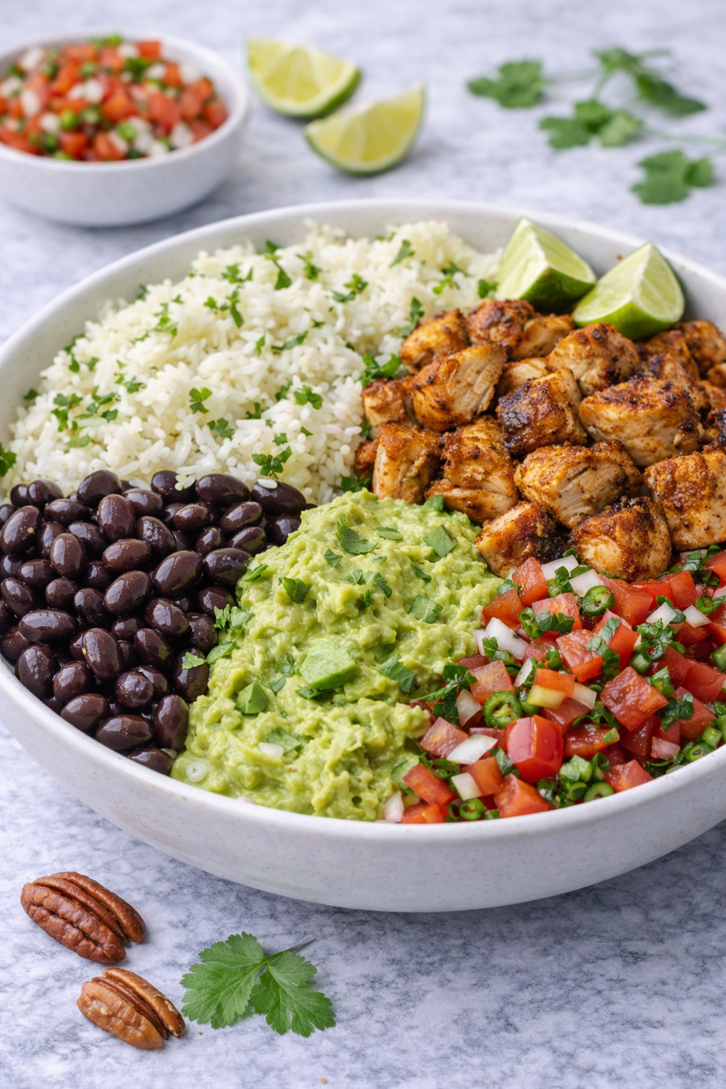 This Mexican Chicken Burrito Bowl is a colorful, flavor-packed meal loaded with juicy seasoned chicken, fluffy rice, hearty beans, creamy guacamole, and fresh salsa. It’s a healthy, customizable dish that brings all your favorite burrito flavors into one satisfying bowl—perfect for meal prep or a quick dinner.