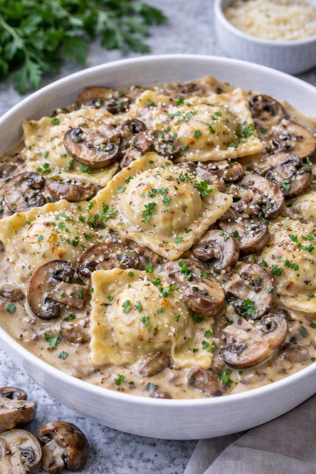 This Mushroom Ravioli with Creamy Mushroom Sauce is a rich, comforting dish loaded with earthy flavors. Tender ravioli is coated in a velvety, garlicky mushroom cream sauce with sautéed mushrooms and a touch of Parmesan. It’s elegant enough for dinner guests but easy enough for a cozy night in.