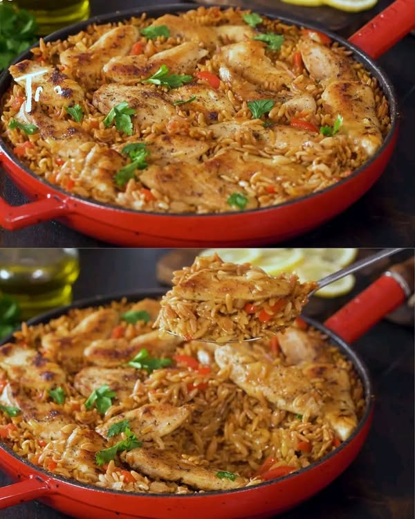 This one-pan chicken and orzo is a flavorful and comforting dish that comes together in under 30 minutes. Tender, seasoned chicken is paired with toasted orzo, sautéed veggies, and a rich, savory broth, making it a perfect weeknight dinner. With minimal cleanup and maximum flavor, this dish is sure to become a household favorite!