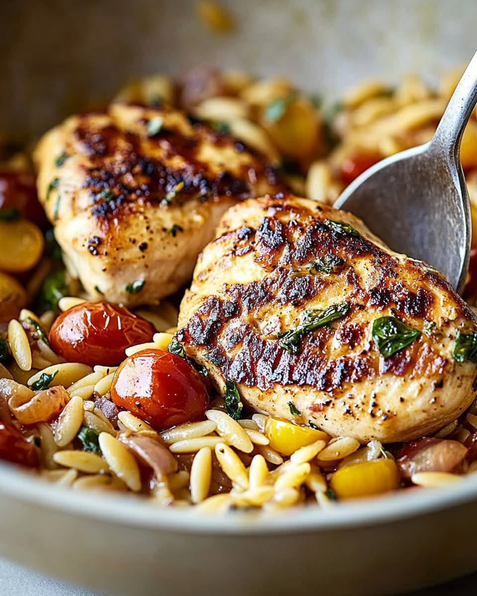 Meal Prep: This dish stores well for leftovers. Keep the chicken and orzo in an airtight container in the fridge for up to 3 days. Reheat gently in the microwave or on the stovetop with a splash of chicken broth to keep it moist.