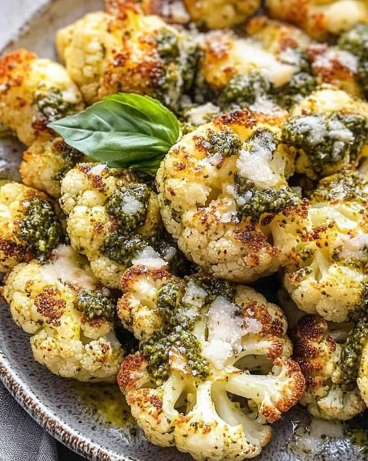 A bold and savory Italian-inspired side dish! Roasted cauliflower tossed in vibrant pesto, finished with melty cheese and fresh herbs—easy, healthy, and packed with flavor.