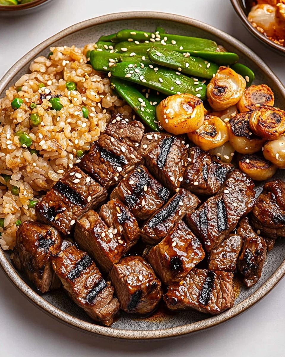 Slice up steak, then serve with rice, vegetables and mustard sauce on the side. Enjoy!