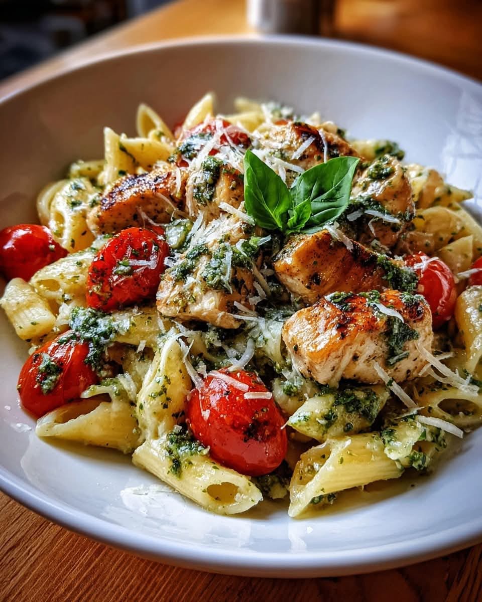 Mediterranean Pesto Chicken Pasta with Cherry Tomatoes
