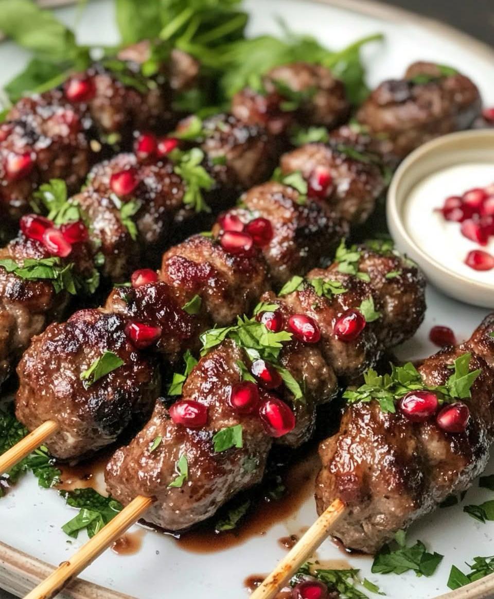 These juicy, spiced kofta skewers are coated in a sweet and tangy pomegranate glaze, making them a perfect balance of savory and fresh flavors. Garnished with vibrant pomegranate seeds and fresh herbs, they’re ideal for a flavorful appetizer or a main course served with yogurt sauce and warm pita.