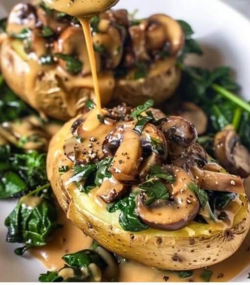 Once the potatoes are done, slice them open lengthwise and gently fluff the insides with a fork. Spoon the mushroom-spinach mixture generously over each potato.
