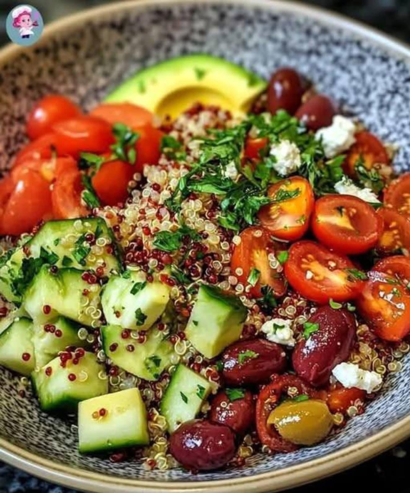 This quinoa salad is a vibrant, nutrient-packed dish that’s perfect for lunch, dinner, or meal prep. Nutty quinoa forms the base, complemented by creamy avocado, sweet roasted red peppers, crisp cucumber, juicy cherry tomatoes, and briny olives. A drizzle of olive oil and a squeeze of lemon juice brings all the flavors together, while optional feta adds a salty, tangy touch.
