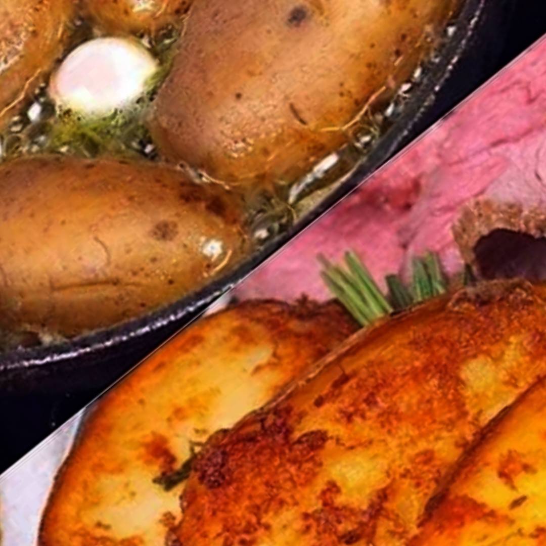 Present the luxury fondant potatoes beside the nicely prepared roast meat pieces.