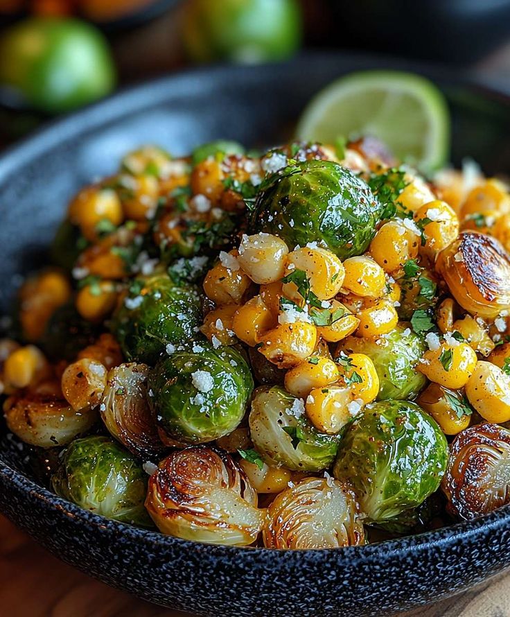 This Roasted Brussels Sprouts & Corn Delight is a bold, flavor-packed dish that transforms simple vegetables into something truly exciting. Crispy roasted Brussels sprouts pair beautifully with sweet corn, while a creamy chili-lime sauce ties everything together with a tangy, slightly smoky kick. Finished with crumbled cotija cheese, fresh cilantro, and a squeeze of lime, this dish delivers a perfect balance of textures and flavors. It works as a standout side or even a light vegetarian main.