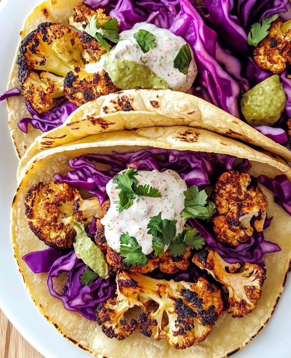 These Roasted Cauliflower Tacos are a flavorful plant-based meal packed with smoky roasted cauliflower tangy red cabbage slaw and a creamy sauce. They’re easy to make naturally vegan-friendly and full of bold flavors. Perfect for a quick weeknight meal or a fun taco night with friends and family.