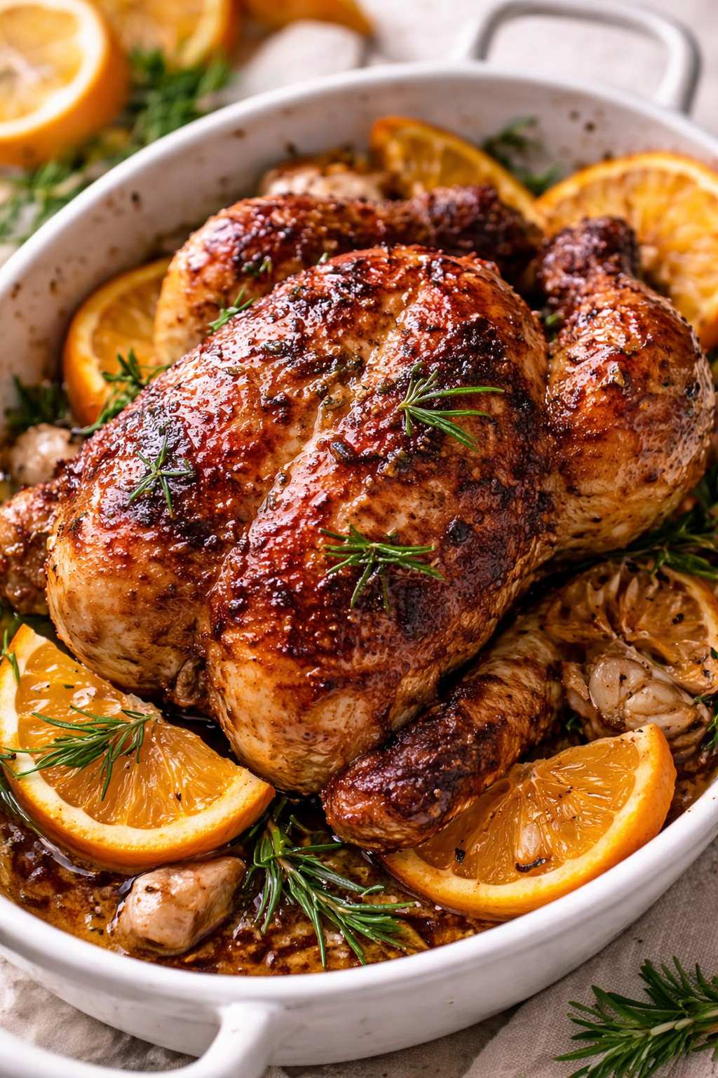 Place chicken in a roasting dish with orange slices, garlic, and rosemary.