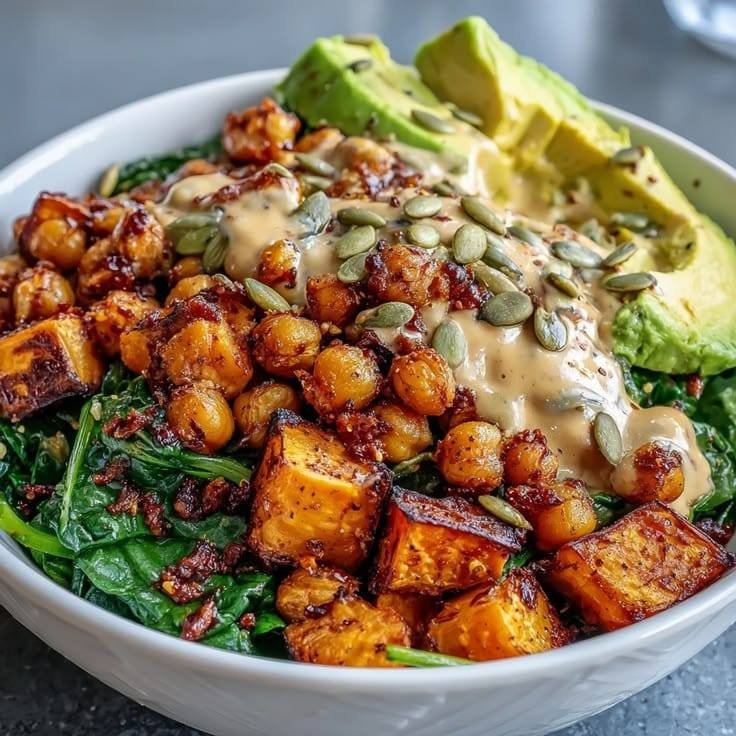 This Roasted Sweet Potato and Chickpea Bowl is a nourishing, flavour-packed meal featuring caramelized sweet potatoes, crispy chickpeas, and a smoky, creamy chipotle tahini sauce. It’s hearty, plant-based, and perfectly balanced—sweet, savoury, and slightly spicy in every bite. Ideal for meal prep or a healthy weeknight dinner.