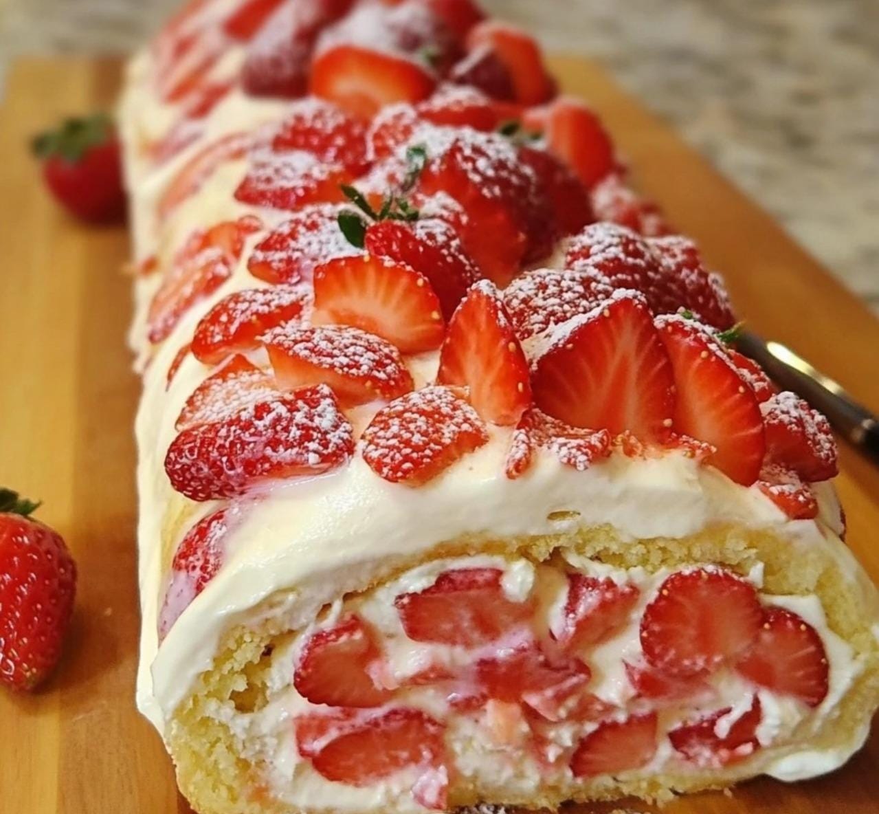 - Unroll the cake after it has cooled and evenly cover the top with whipped cream. Place sliced strawberries on top.