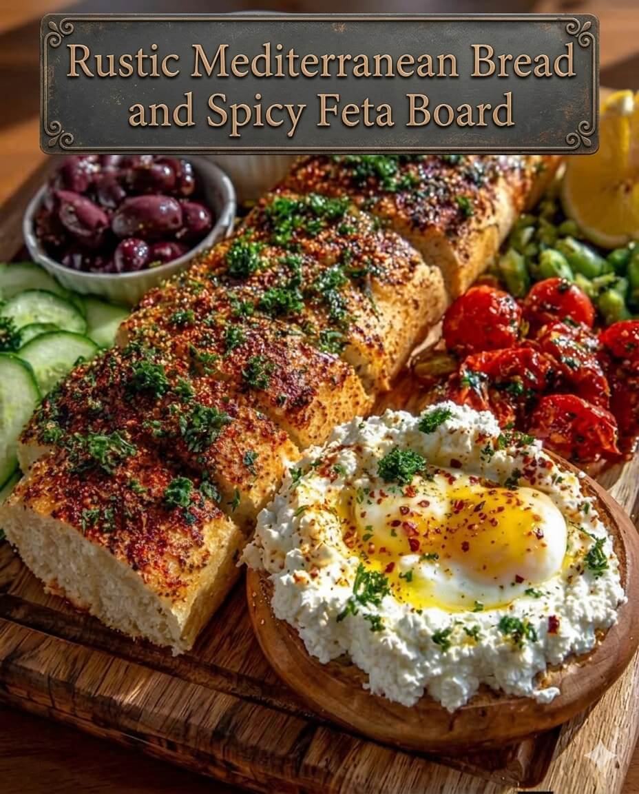 This Rustic Mediterranean Bread and Spicy Feta Board is the perfect blend of crunchy, creamy, spicy, and fresh. The golden toasted bread, garlicky aroma, silky whipped feta, and vibrant vegetables create a balanced spread that feels both rustic and refined.