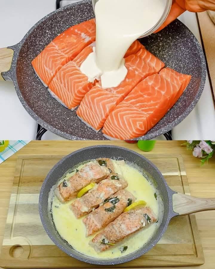 - Place the salmon back into the skillet, and then spoon some of the sauce over the top that you just made. Allow the mixture to simmer for two to three minutes, or until the salmon is completely heated through and the creamy sauce has coated it.