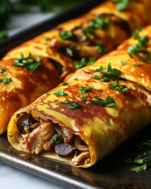 4. Assemble: Place each crepe on a baking sheet after stuffing it with chicken mixture and rolling it up. Place the parmesan cheese on top and melt it in the oven for two to three minutes.