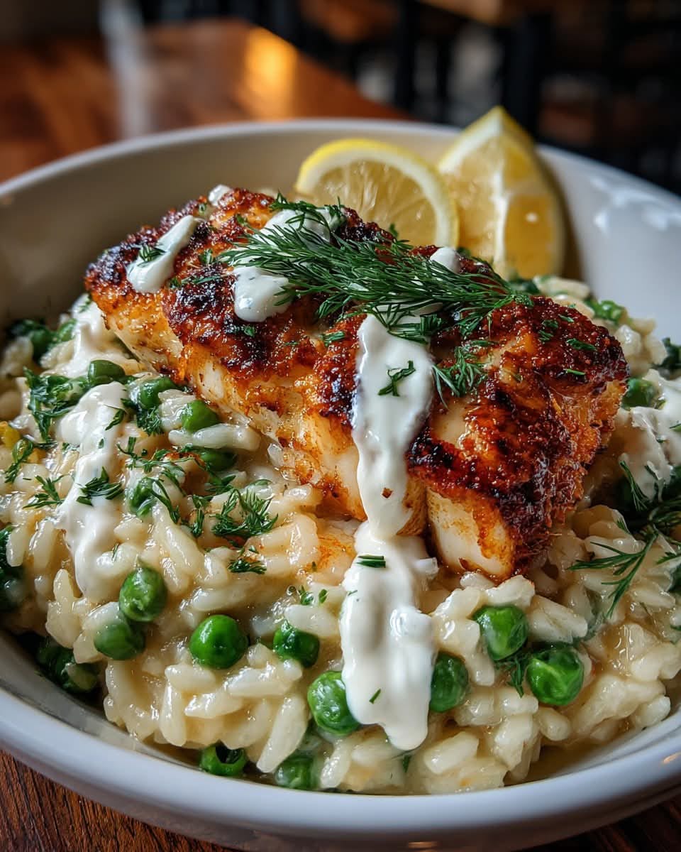 This sheet pan cod and spring pea risotto is a fresh, elegant meal that feels gourmet but is surprisingly simple to prepare. The cod bakes to flaky perfection while a creamy pea risotto cooks alongside, absorbing bright flavors and natural sweetness. Finished with a high-protein lemon-herb crema made from Greek yogurt, this dish strikes a perfect balance between comfort and lightness. It’s ideal for spring dinners, special occasions, or whenever you want something wholesome yet refined.