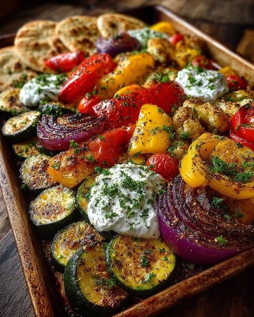 Sheet-Pan Roasted Veggies with Tzatziki and Pita is a colorful, nourishing meal that celebrates simple Mediterranean flavors. The roasted vegetables provide warmth and sweetness, while the creamy tzatziki offers a refreshing contrast. Easy preparation and minimal cleanup make it ideal for busy days, and the flexible ingredient list allows for endless customization. Whether served as a vegetarian main dish, a light lunch, or a flavorful side, this recipe delivers satisfying texture and fresh taste with very little effort.