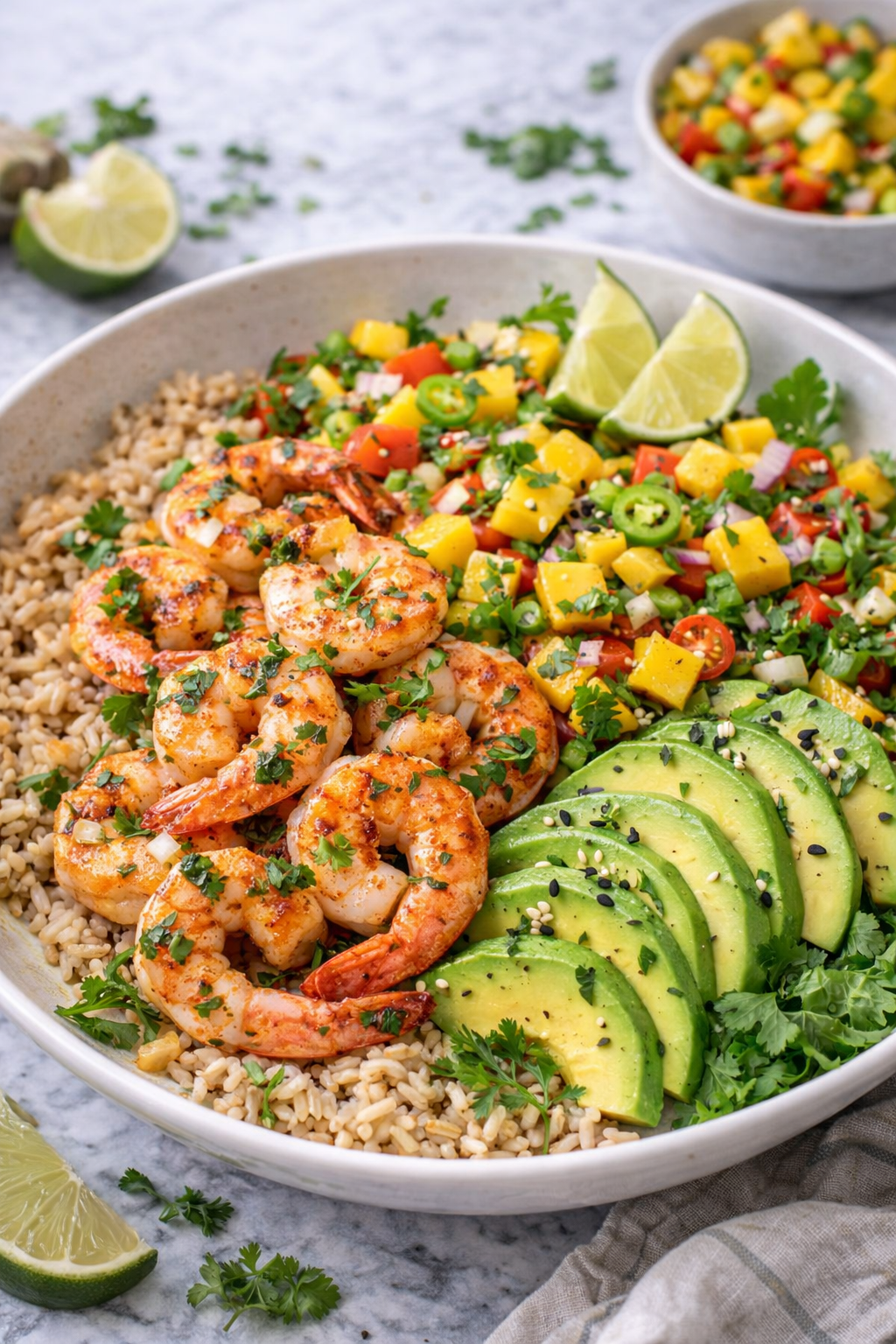 Add rice or quinoa to bowls, then top with shrimp, avocado slices, and mango salsa. - Serve: