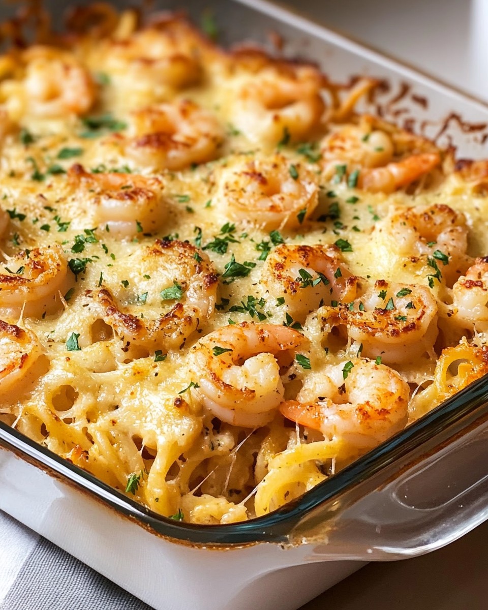 - After the pasta has been cooked, put it in the baking dish that has been prepared and toss it with the sauce. Place the shrimp that have been cooked on top.