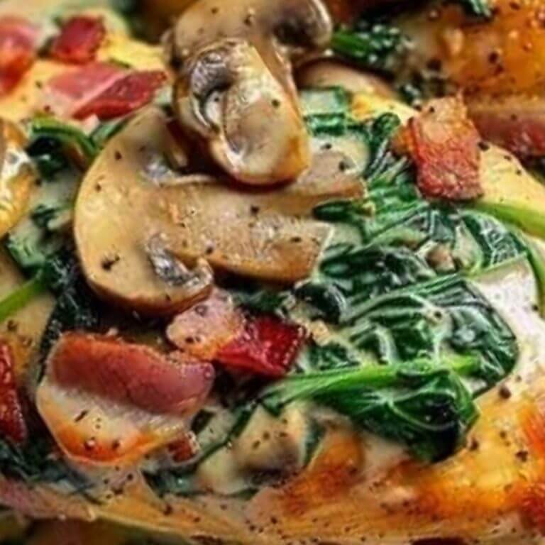 7. Return chicken to the skillet, spooning sauce over the top. Sprinkle with cooked bacon and simmer for 5 minutes.