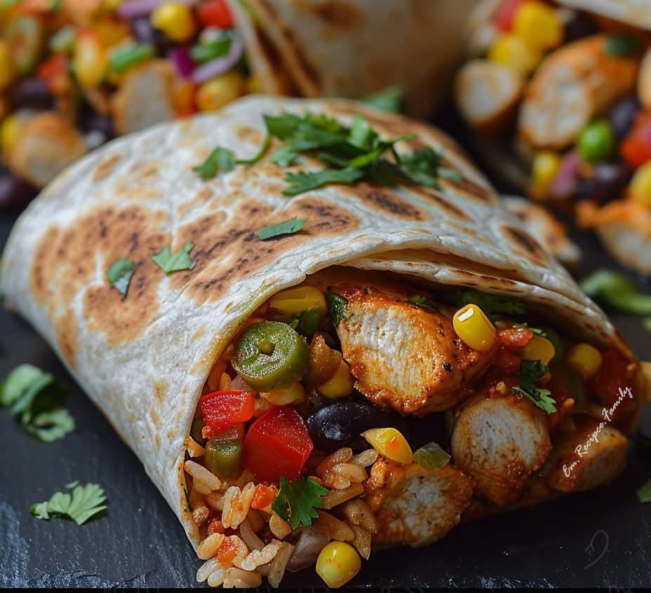- Once the chicken and veggies are warmed through, heat up your tortillas or wraps and start to stuff them. Start with rice, chicken, veggies, beans, corn, cheese and drizzle a generous amount of sauce over all the ingredients.