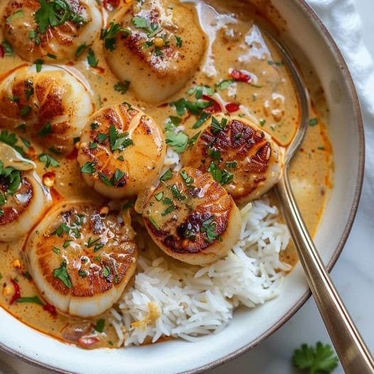 Tastes of Spicy Coconut Curry Scallops, a meal that strikes the ideal balance of umami, creaminess, and spice. A rich coconut curry sauce flavored with ginger, garlic, and a touch of chile for the ideal kick envelops succulent, grilled scallops.