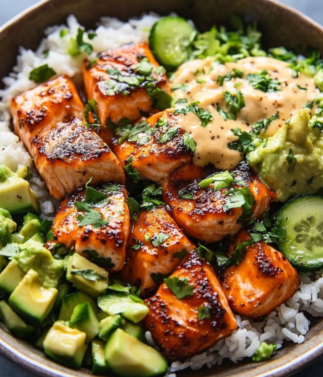 This Spicy Salmon Rice Bowl is a flavorful and nutritious meal, combining tender, caramelized salmon bites with creamy avocado, crisp cucumber, and a spicy mayo drizzle over fluffy white rice. It’s the perfect balance of heat, freshness, and richness—all in one bowl! Great for a quick and satisfying lunch or dinner.