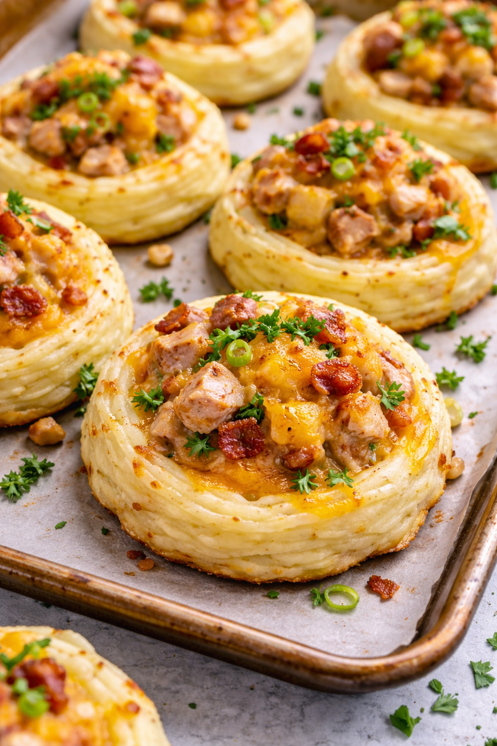 These Stuffed Mashed Potato Nests are a fun, delicious twist on classic mashed potatoes. Creamy mashed potatoes are shaped into crispy-edged nests, then filled with a savoury mixture of chicken, cheese, and bacon, and baked until golden and bubbly. Perfect as an appetizer, snack, or side dish, they’re crispy on the outside, soft inside, and packed with flavour.