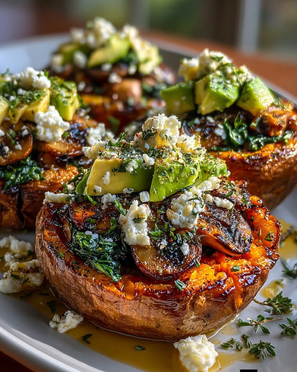 Stuffed Sweet Potatoes with Sautéed Mushroom Spinach Filling, Avocado & Feta