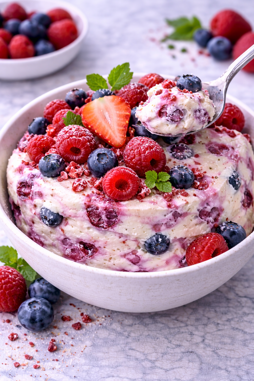 This Sugar-Free Mixed Berry Semifreddo is a light, creamy Italian frozen dessert that blends whipped cream, fluffy eggs, and vibrant berries into a silky, mousse-like treat. Naturally sweetened and layered with fresh strawberries, raspberries, and blueberries, it’s refreshing, indulgent, and perfect for a healthier dessert option—served beautifully in a bowl.