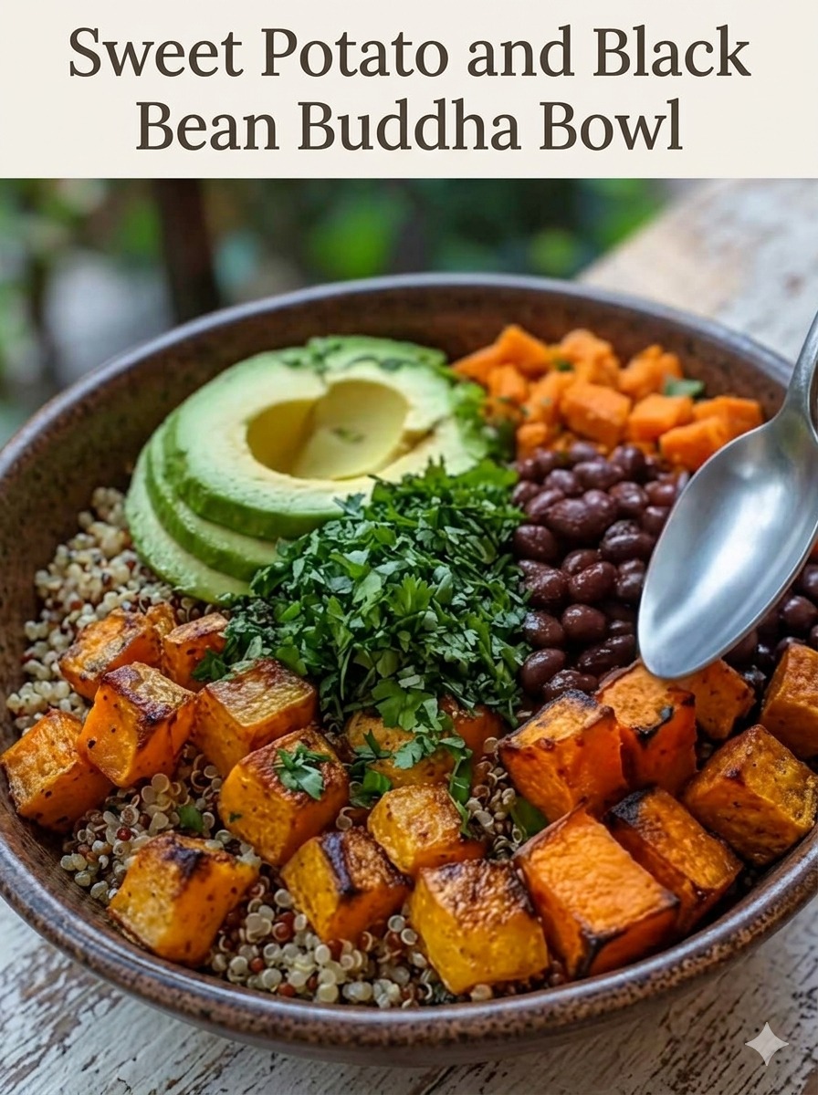 The Sweet Potato and Black Bean Buddha Bowl is a colorful, nourishing meal that brings together roasted vegetables, hearty grains, plant-based protein, and fresh toppings in one balanced bowl. It’s packed with flavor from smoky spices, creamy avocado, and a bright, zesty dressing. Perfect for meal prep or a wholesome lunch or dinner, this bowl is satisfying, customizable, and fits beautifully into a healthy lifestyle.