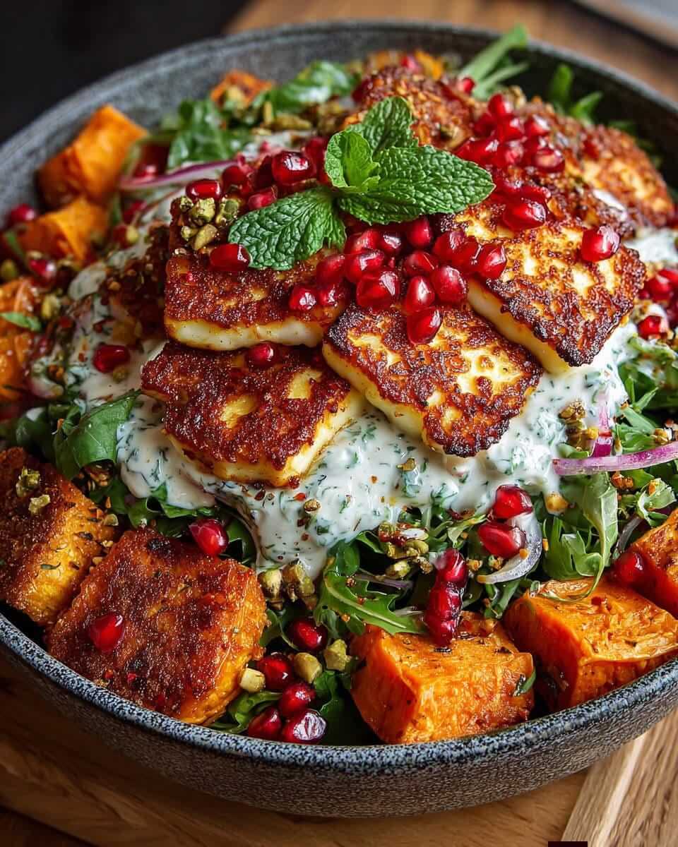 Sweet potato, halloumi, and pomegranate come together in a salad that’s vibrant, satisfying, and full of contrast. Warm roasted vegetables, golden cheese, crisp greens, and creamy mint dressing create layers of flavor and texture in every bite. It’s a wholesome dish that feels special without extra effort. Serve fresh and enjoy.
