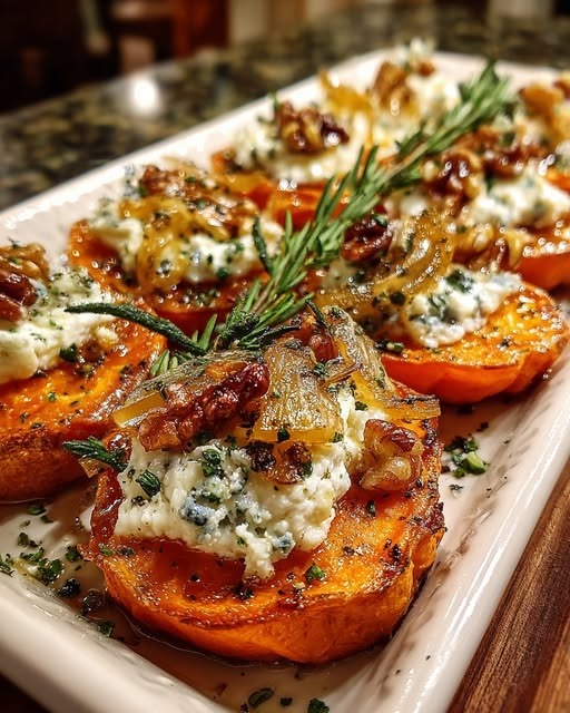 Sweet Potato Slices with Gorgonzola Cream, Caramelized Shallots, and Walnut Brittle is a dish that feels thoughtfully composed yet approachable. The natural sweetness of the potatoes, the richness of the cheese sauce, the savory depth of shallots, and the crisp bite of walnut brittle create a balance that keeps every bite interesting. Whether you serve it as a standout side dish or a vegetarian centerpiece, this recipe brings warmth, contrast, and elegance to the table. It is the kind of dish that looks impressive, tastes memorable, and invites you to slow down and enjoy the details.
