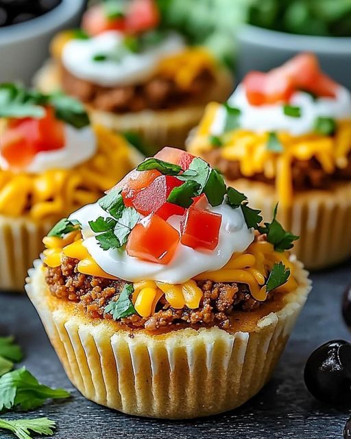 - Once baked, remove from the oven and allow to cool for a few minutes. Top each cupcake with sour cream, salsa, and chopped black olives, if preferred. Garnish with fresh cilantro.