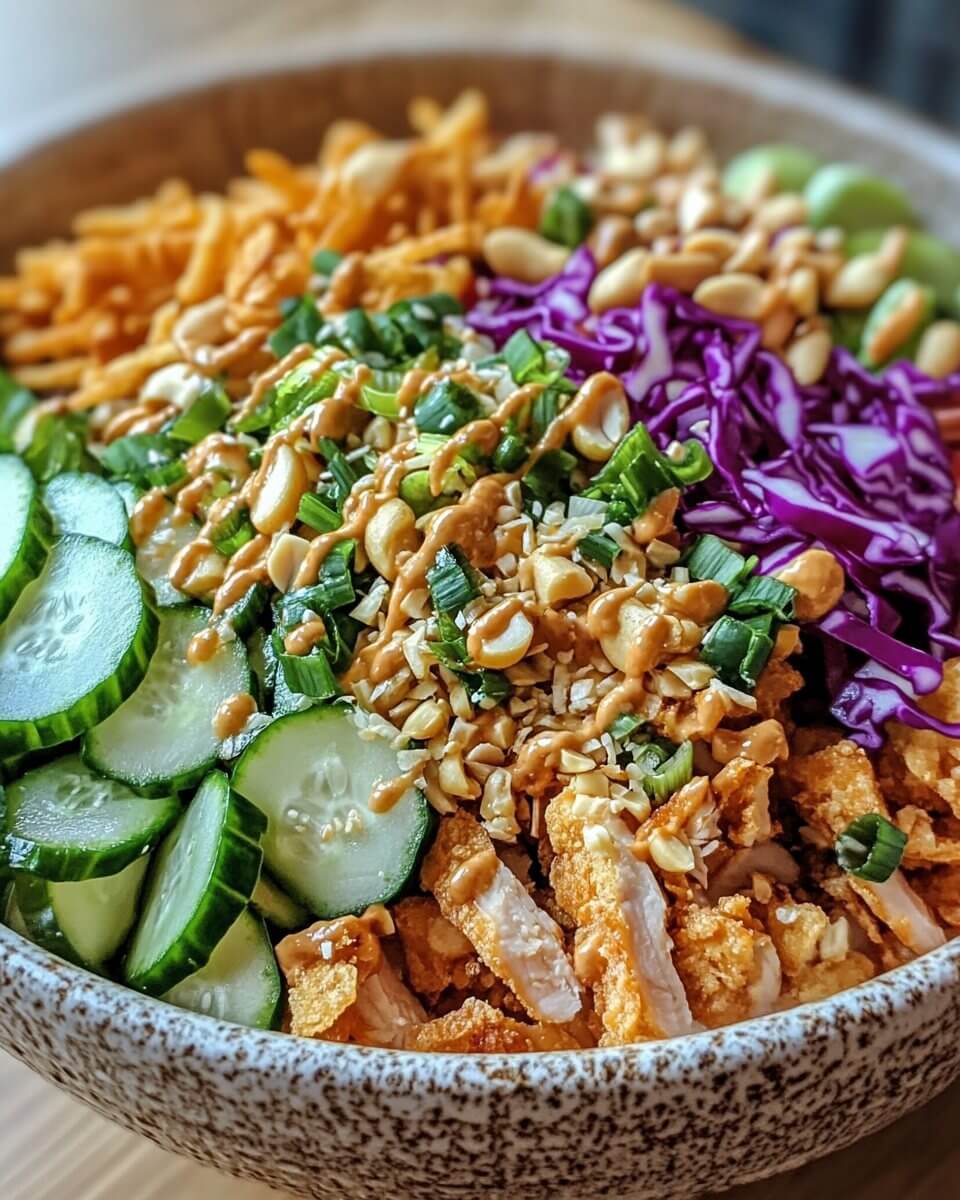 In a large mixing bowl, combine the sliced cucumbers, red cabbage, chopped cilantro, peanuts, red bell pepper, and green onions. Add the crispy rice and teriyaki chicken.
