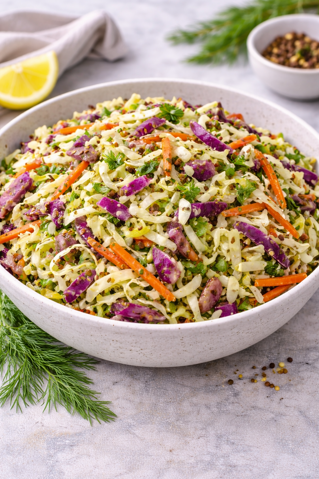 This crisp and refreshing vinegar-based coleslaw is a lighter, tangier alternative to creamy slaw. Made with shredded cabbage, carrots, and a zesty vinegar dressing, it delivers the perfect balance of sweet, sour, and savory flavors. It’s ideal for BBQs, sandwiches, or as a healthy side dish that won’t feel heavy.